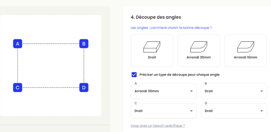 Par défaut votre sélection s'appliquera sur tous les angles. Mais il est aussi possible de choisir sur quel angle vous souhaitez porter votre arrondi. Il vous suffit d'activer la fonction "préciser le type de découpe pour chaque angle", et de choisir les angles en fonction de leur identification dans la visionneuse.