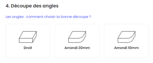 Par exemple, pour des projets de table nous vous conseillons un arrondi pour réduire les chances de contact douloureux avec le plateau.
